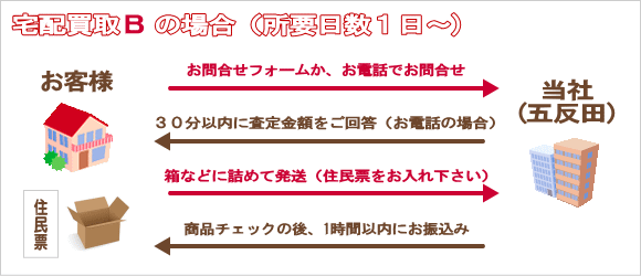 そちらの金額にご納得いただけたら、当社より『買取セット』をお客様のご住所にお送りします。到着しましたら、セットの中に入っている『買取申込書』をご記入の上、商品と免許証(またはパスポート)のコピーと一緒に同封し、着払いのゆうパック(または宅急便)でお送り下さい(お客様の送料ご負担はございません)。